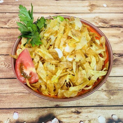 Сделан из трески собственного копчения с добавлением сельдерея, яблока, редиса, свежего огурчика и кукурузы. Заправка сметанно-майонезная